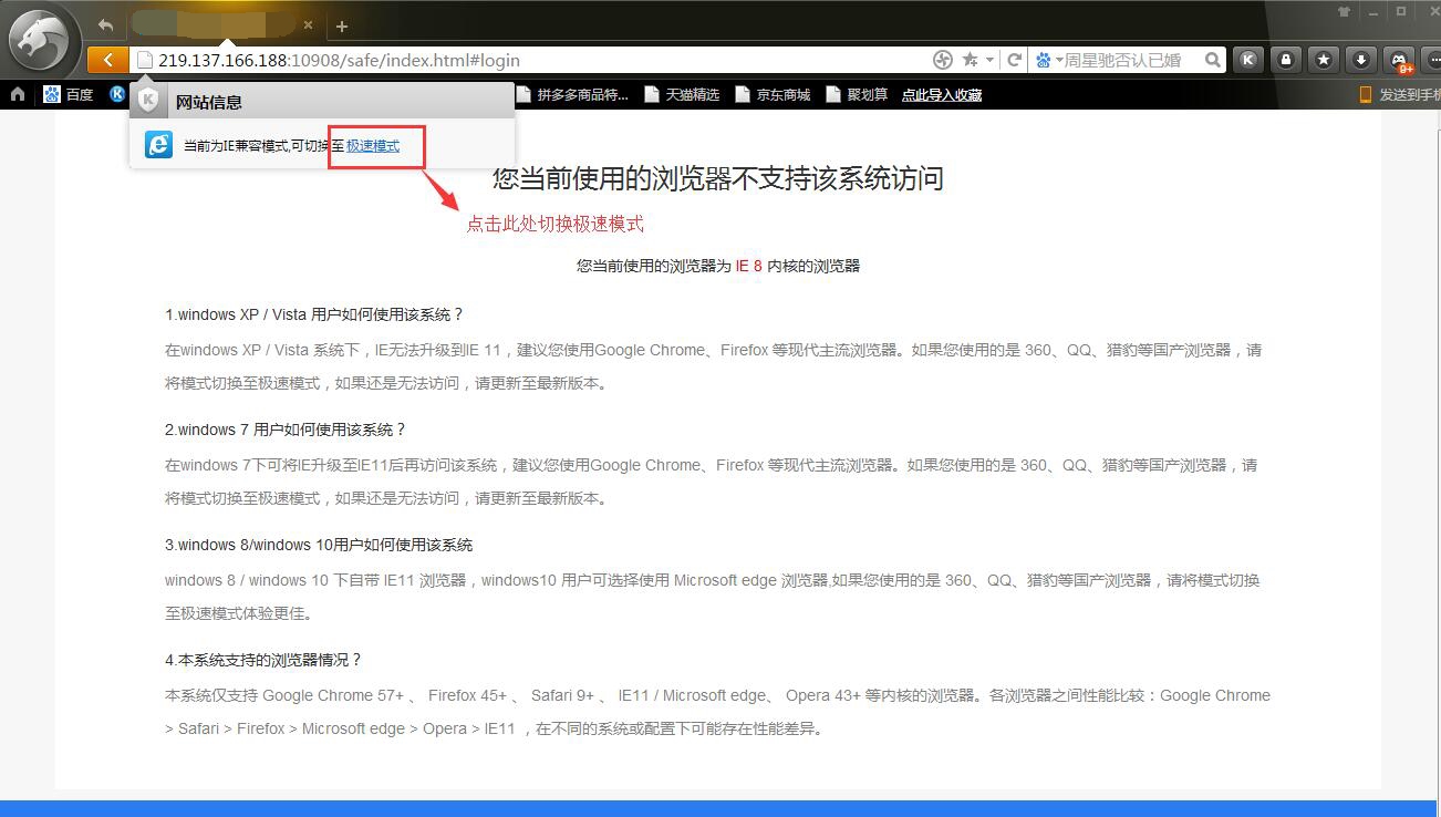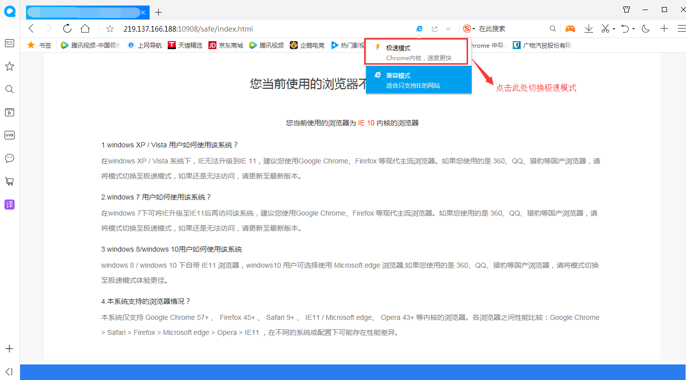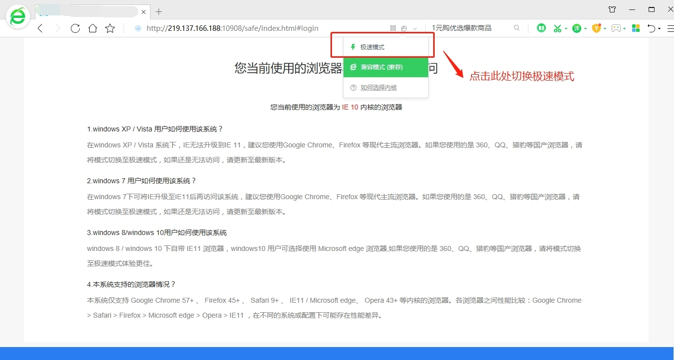 360、QQ、猎豹等国产浏览器无法打开该系统,请将模式切换至极速模式: